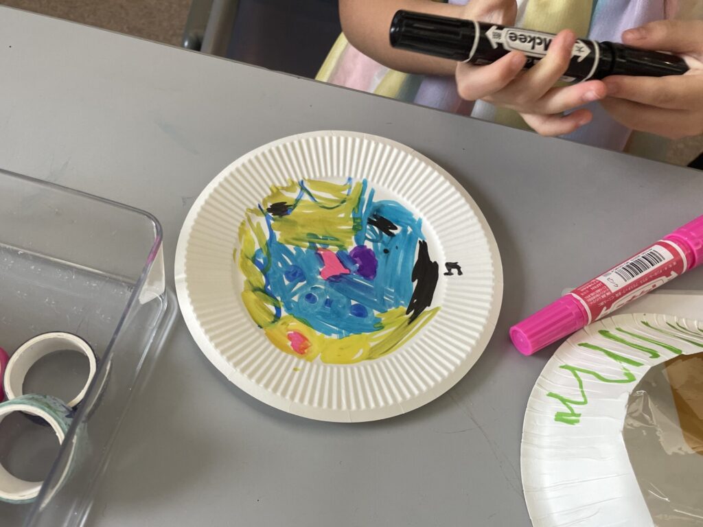 準備ができたら、ペンやマスキングテープで紙皿と紙ボウルをデコレーション🎂🍩🍦