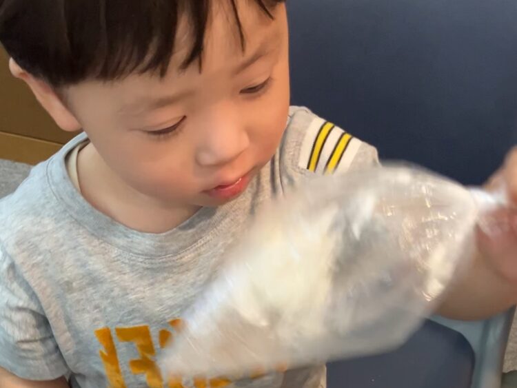 ビニール袋に粉せっけんと水をいれてシャカシャカ🎉🎉