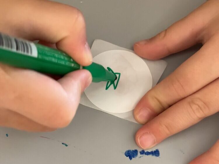 丸いシールに目玉を描いて、ビニール袋に貼って、