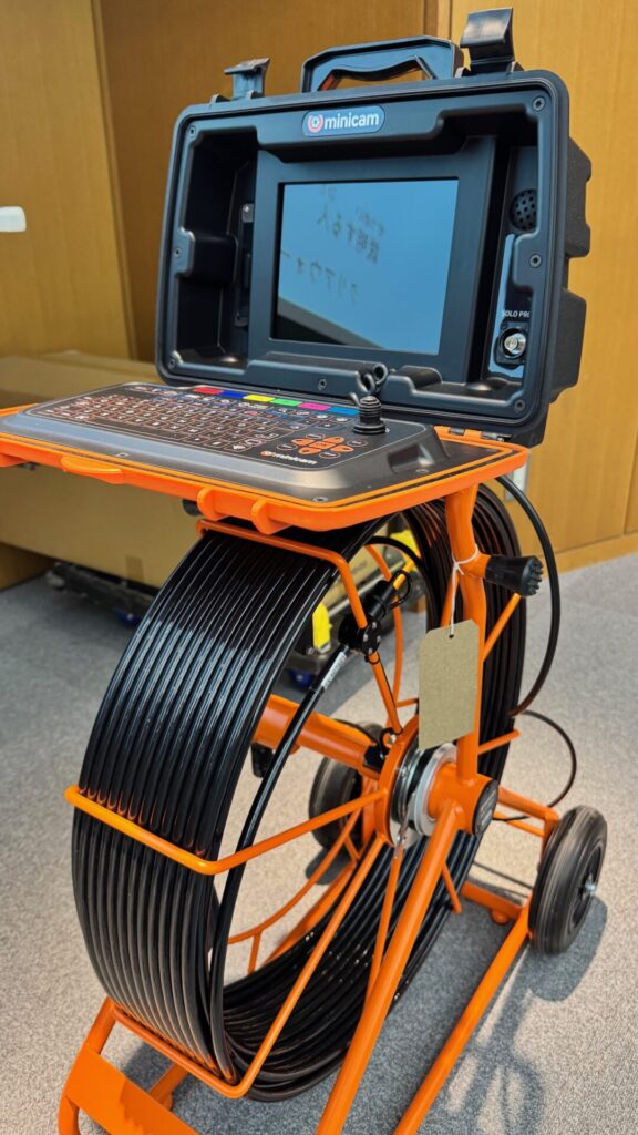 家庭の排水管と下水管の本管をつなぐ管を検査するカメラです。大きな内視鏡みたいな感じです。先端にはライトが着いていて、暗い下水管の中が良く分かるように工夫されていて、そのカメラの映像を確認できるモニターや画像を保存できるPCが搭載されたマシンです。