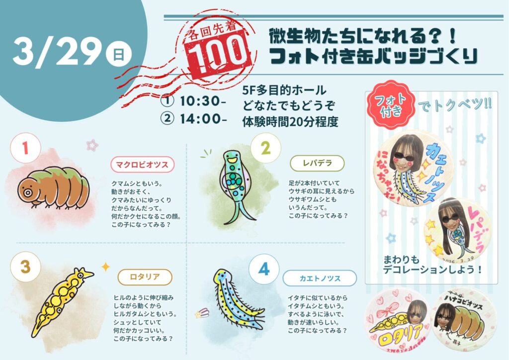 さて。次回3月29日は「微生物になれる?!フォト付き!缶バッチをつくろう!」です。