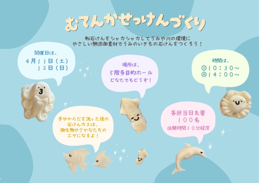 次回4/11.12は「うみのいきもの無添加石けんづくり」です。